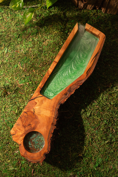 Please specify what features you would like your piece to include. Example: a carved space for a 2" grinder, a groove for a lighter, etc. Also specify if you would like a color of epoxy or copper detail included. What shape would you like? Would you like raw edges? Would you like it include bark?